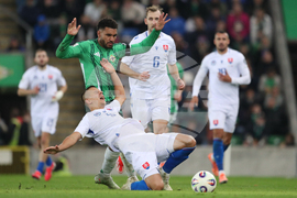 Slovakia's Lubomir Satka, bottom, and Ireland's Jamie Reid in action during a World Cup 2026 group A qualifying soccer match between Northern Ireland and Slovakia at Windsor Park stadium, in Belfast, Northern Ireland, Friday, Oct. 10, 2025. (AP Photo/Peter Morrison)