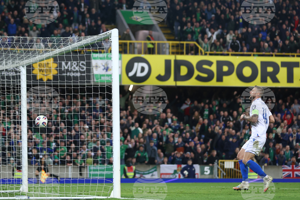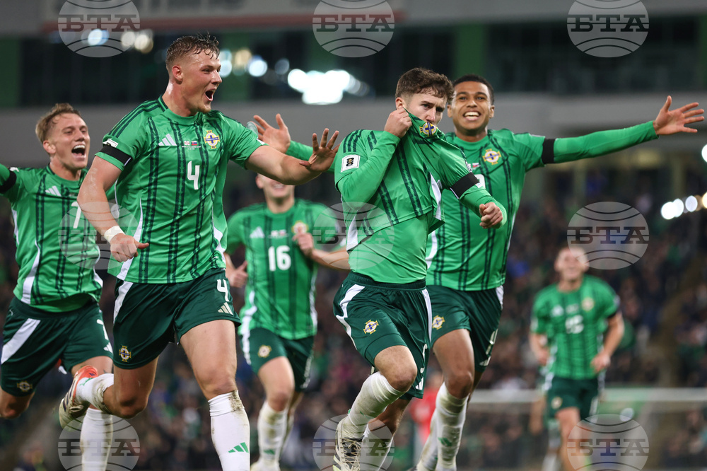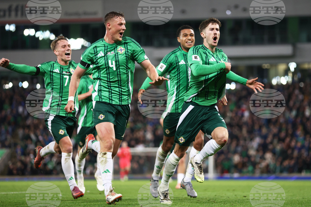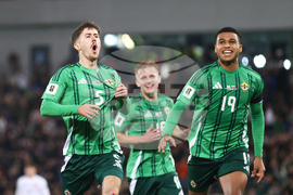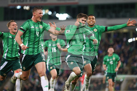 Ireland's Trai Hume, second right, celebrates after scoring his side's second goal during a World Cup 2026 group A qualifying soccer match between Northern Ireland and Slovakia at Windsor Park stadium, in Belfast, Northern Ireland, Friday, Oct. 10, 2025. (AP Photo/Peter Morrison)