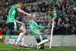 Ireland's Trai Hume celebrates after scoring his side's second goal during a World Cup 2026 group A qualifying soccer match between Northern Ireland and Slovakia at Windsor Park stadium, in Belfast, Northern Ireland, Friday, Oct. 10, 2025. (AP Photo/Peter Morrison)