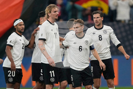 Germany's Jonathan Tah and Serge Gnabry celebrate Nick Woltemade, from left, for a goal that was disallowed during the World Cup 2026 group A qualifying soccer match between Germany and Luxembourg in Sinsheim, Germany, Friday, Oct. 10, 2025. (AP Photo/Michael Probst)