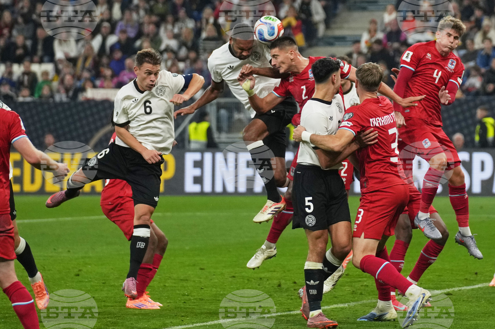 Germany's Jonathan Tah and Luxembourg's Seid Korac jump for the ball during the World Cup 2026 group A qualifying soccer match between Germany and Luxembourg in Sinsheim, Germany, Friday, Oct. 10, 2025. (AP Photo/Michael Probst)