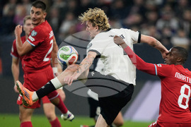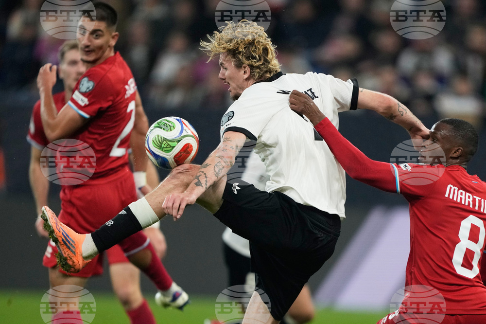 Germany's Nick Woltemade, left, and Luxembourg's Christopher Martins, right, challenge for the ball during the World Cup 2026 group A qualifying soccer match between Germany and Luxembourg in Sinsheim, Germany, Friday, Oct. 10, 2025. (AP Photo/Michael Probst)