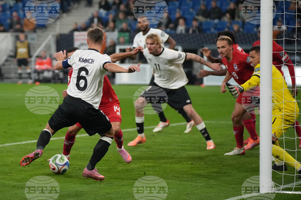 Germany's Joshua Kimmich scores his side's 4th goal during the World Cup 2026 group A qualifying soccer match between Germany and Luxembourg in Sinsheim, Germany, Friday, Oct. 10, 2025. (AP Photo/Michael Probst)