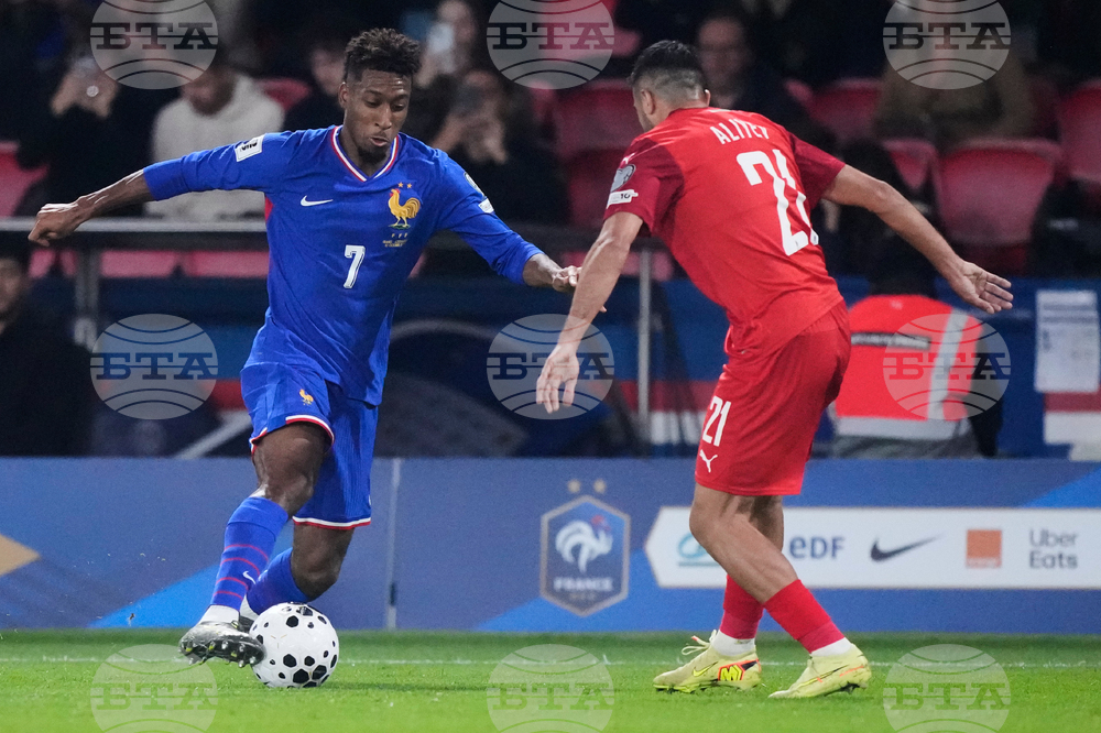 Azerbaijan's Gismat Aliyev, left, and France's Kingsley Coman run for the ball during a World Cup 2026 Group D qualifying soccer match between France and Azerbaijan in Paris, France, on Friday, Oct. 10, 2025. (AP Photo/Michel Euler)