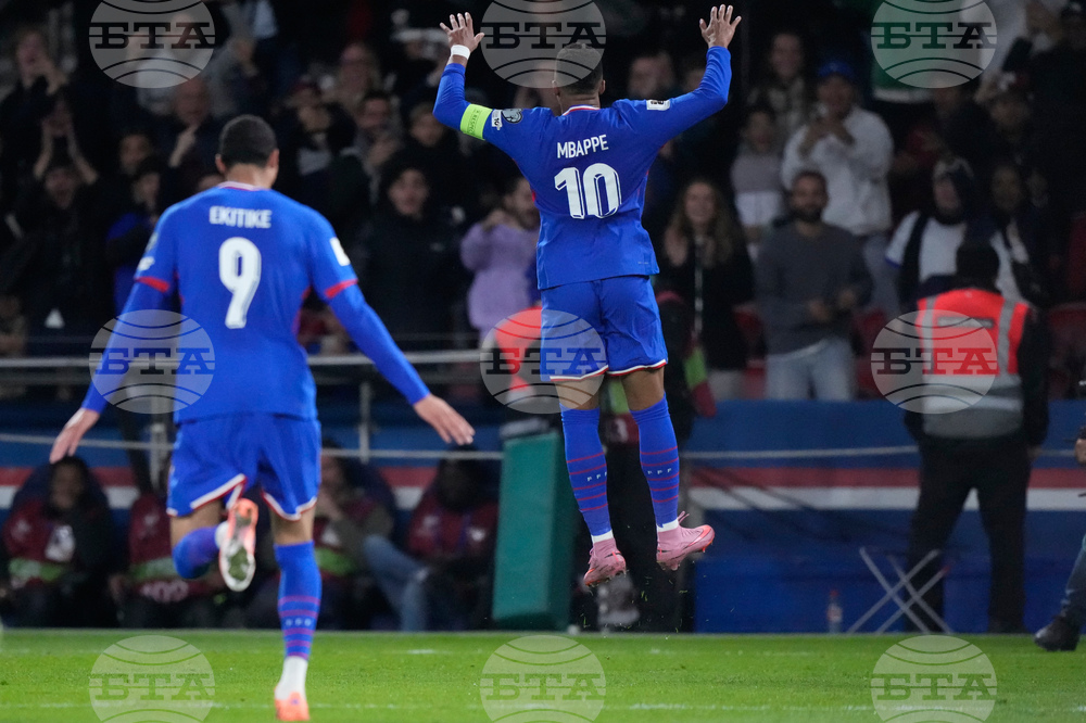 France's Kylian Mbappe celebrates after scoring during a World Cup 2026 Group D qualifying soccer match between France and Azerbaijan in Paris, France, on Friday, Oct. 10, 2025. (AP Photo/Michel Euler)