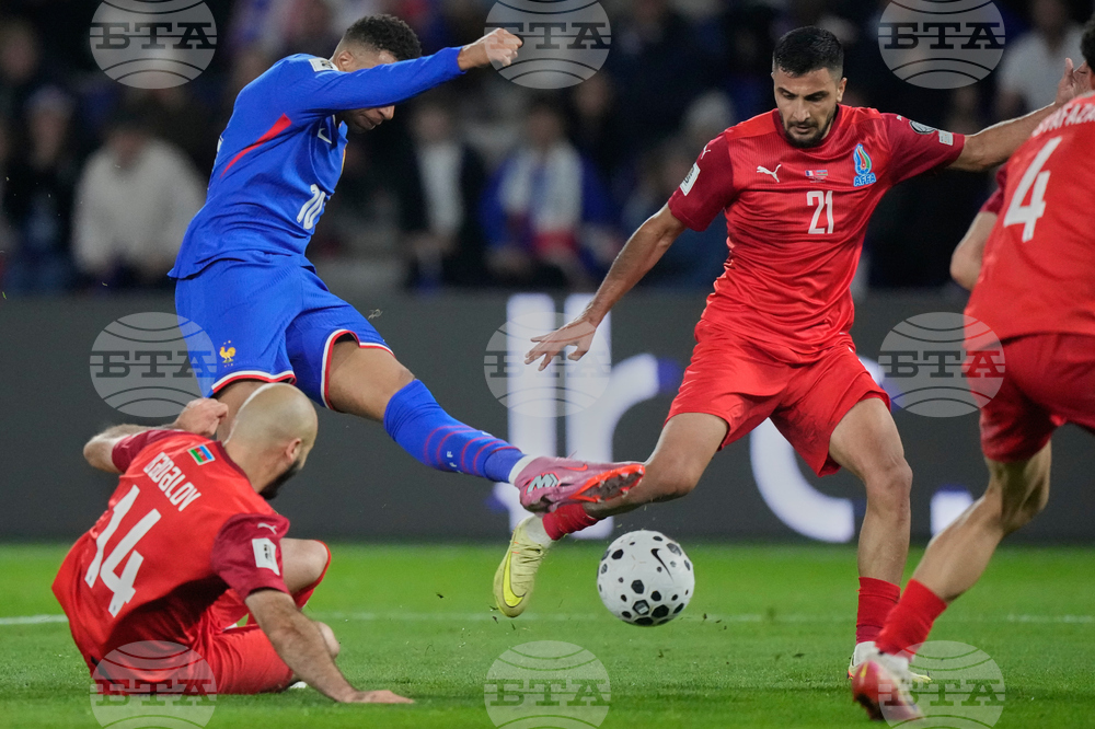 France's Kylian Mbappe shoots by Azerbaijan's Gismat Aliyev during a World Cup 2026 Group D qualifying soccer match between France and Azerbaijan in Paris, France, on Friday, Oct. 10, 2025. (AP Photo/Michel Euler)