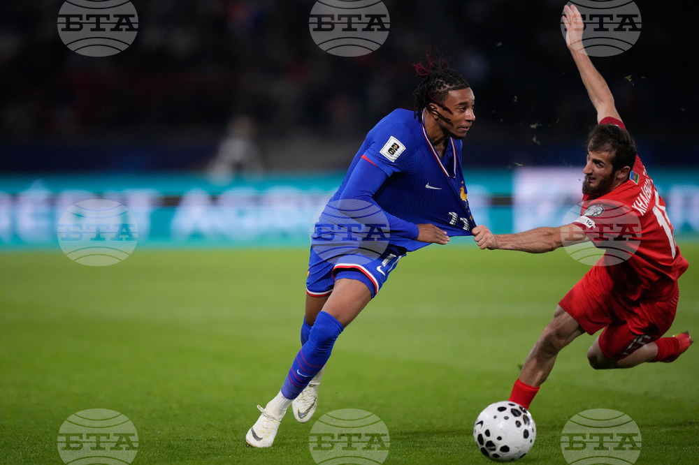 Azerbaijan's Anton Krivotsyuk pulls France's Hugo Ekitike during a World Cup 2026 Group D qualifying soccer match between France and Azerbaijan in Paris, France, on Friday, Oct. 10, 2025. (AP Photo/Michel Euler)