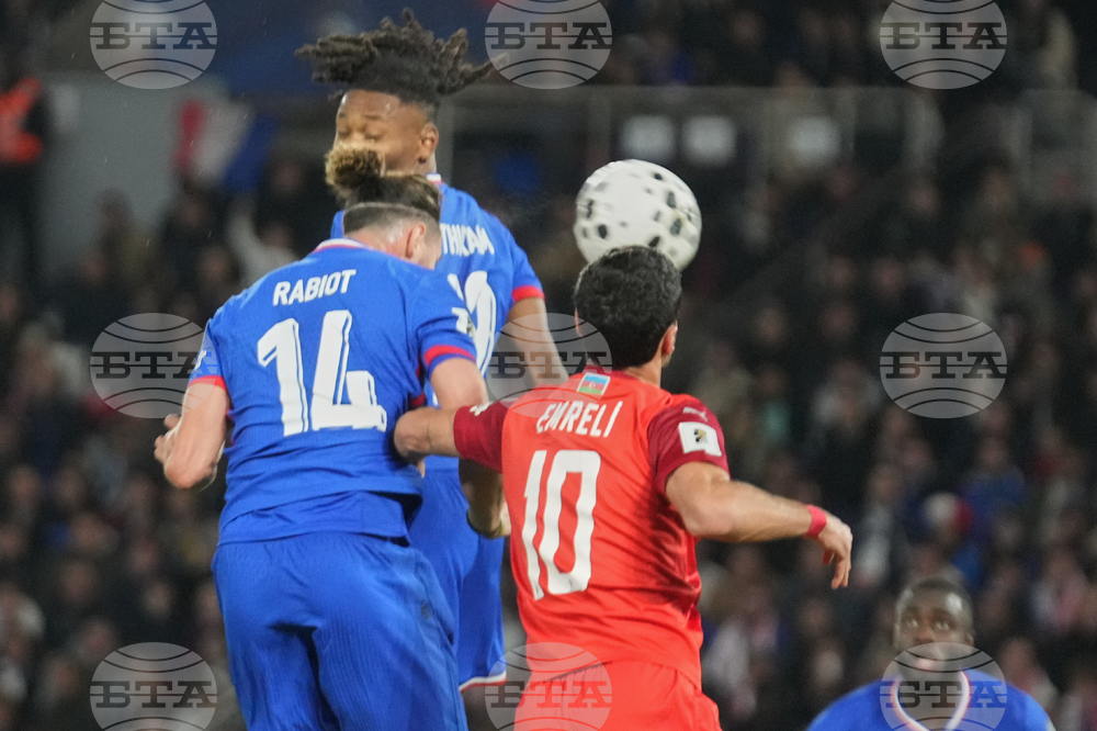 France's Hugo Ekitike, left, and Azerbaijan's Anton Krivotsyuk jump fpr the ball during a World Cup 2026 Group D qualifying soccer match between France and Azerbaijan in Paris, France, on Friday, Oct. 10, 2025. (AP Photo/Michel Euler)