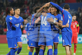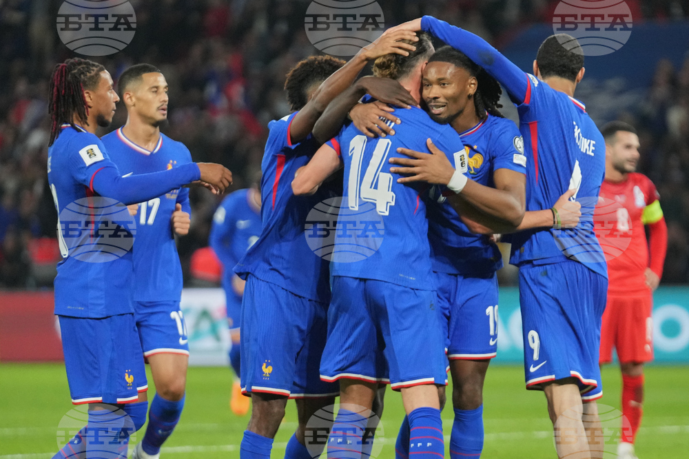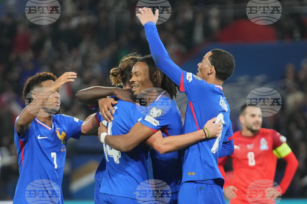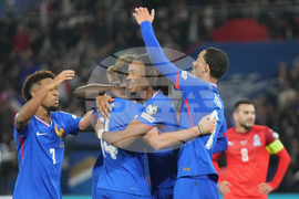 French players celebrate after a goal during a World Cup 2026 Group D qualifying soccer match between France and Azerbaijan in Paris, France, on Friday, Oct. 10, 2025. (AP Photo/Michel Euler)