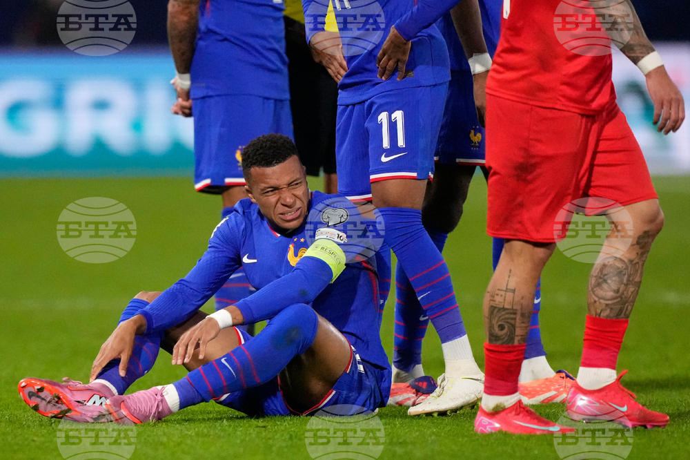 France's Kylian Mbappe grimaces in pain during a World Cup 2026 Group D qualifying soccer match between France and Azerbaijan in Paris, France, on Friday, Oct. 10, 2025. (AP Photo/Michel Euler)