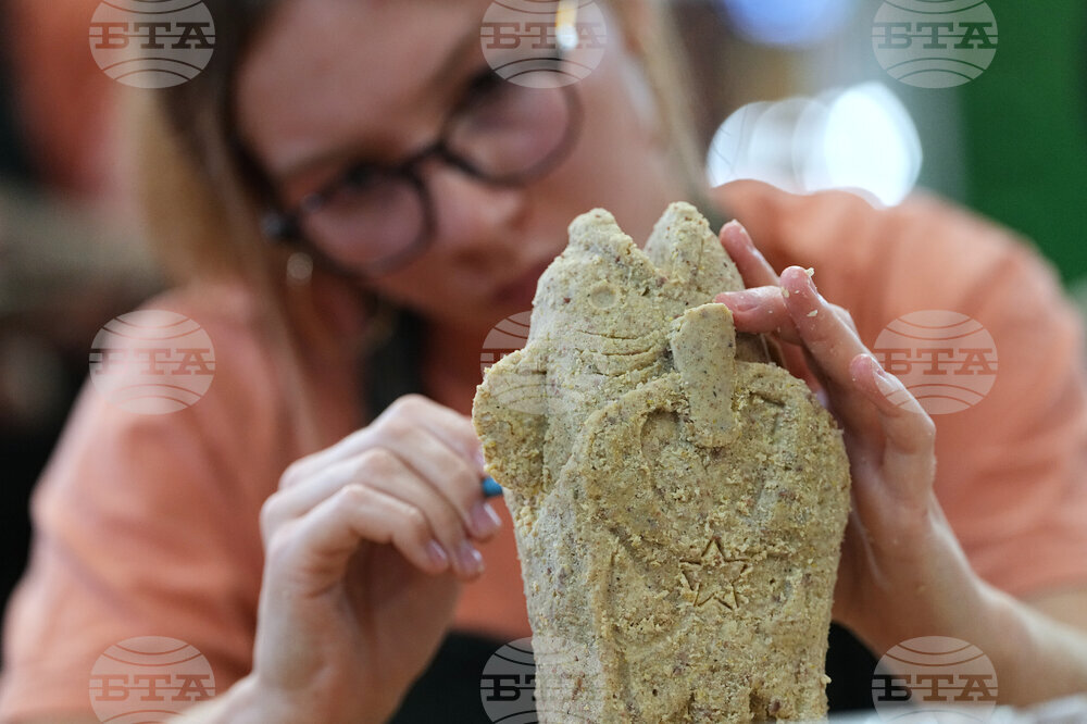 Helen Reynolds creates her interpretation of the Philadelphia Flyers mascot Gritty at the Scrapple Sculpting Contest at the Reading Terminal Market in Philadelphia, Friday, Oct. 10, 2025. (AP Photo/Matt Rourke)