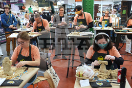 Contestants work on their entries in Scrapple Sculpting Contest at the Reading Terminal Market in Philadelphia, Friday, Oct. 10, 2025. (AP Photo/Matt Rourke)