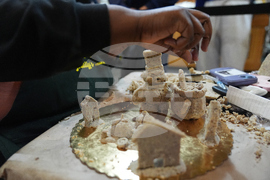 Toni Lee works on her entry to Scrapple Sculpting Contest at the Reading Terminal Market in Philadelphia, Friday, Oct. 10, 2025. (AP Photo/Matt Rourke)