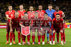 Switzerland's starting 11 pose before a World Cup qualifying soccer match between Sweden and Switzerland at Strawberry Arena, Friday, Oct. 10, 2025, in Stockholm, Sweden. ( Anthony Anex/Keystone via AP)