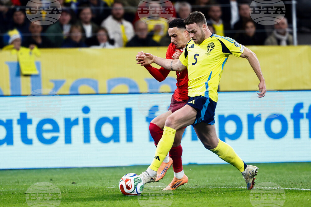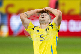 Sweden's Gabriel Gudmundsson reacts during a World Cup qualifying soccer match between Sweden and Switzerland at Strawberry Arena, Friday, Oct. 10, 2025, in Stockholm, Sweden. ( Anthony Anex/Keystone via AP)