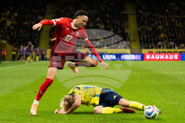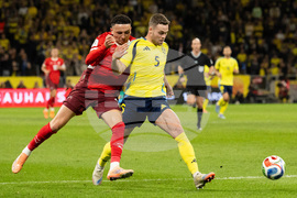 Swedens Isak Hien, left, and Switzerland's Breel Embolo in action during a World Cup qualifying soccer match between Sweden and Switzerland at Strawberry Arena, in Stockholm, Sweden, Friday, Oct. 10, 2025. (Anthony Anex/Keystone via AP)