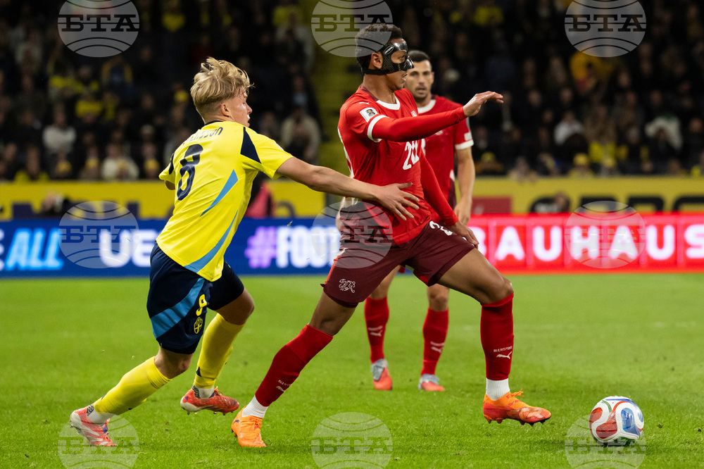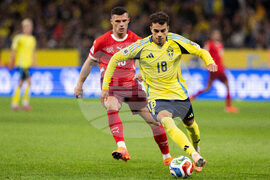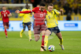 Switzerland's Ruben Vargas, left, and Sweden's Gabriel Gudmundsson battle for the ball during a World Cup qualifying soccer match between Sweden and Switzerland at Strawberry Arena, Friday, Oct. 10, 2025, in Stockholm, Sweden. ( Anthony Anex/Keystone via AP)