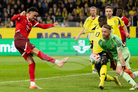 Switzerland's Johan Manzambi, center, celebrates after scoring his side's second goal against Swedens goalkeeper Viktor Johansson, right, during a World Cup qualifying soccer match between Sweden and Switzerland at Strawberry Arena, in Stockholm, Sweden, Friday, Oct. 10, 2025. (Anthony Anex/Keystone via AP)
