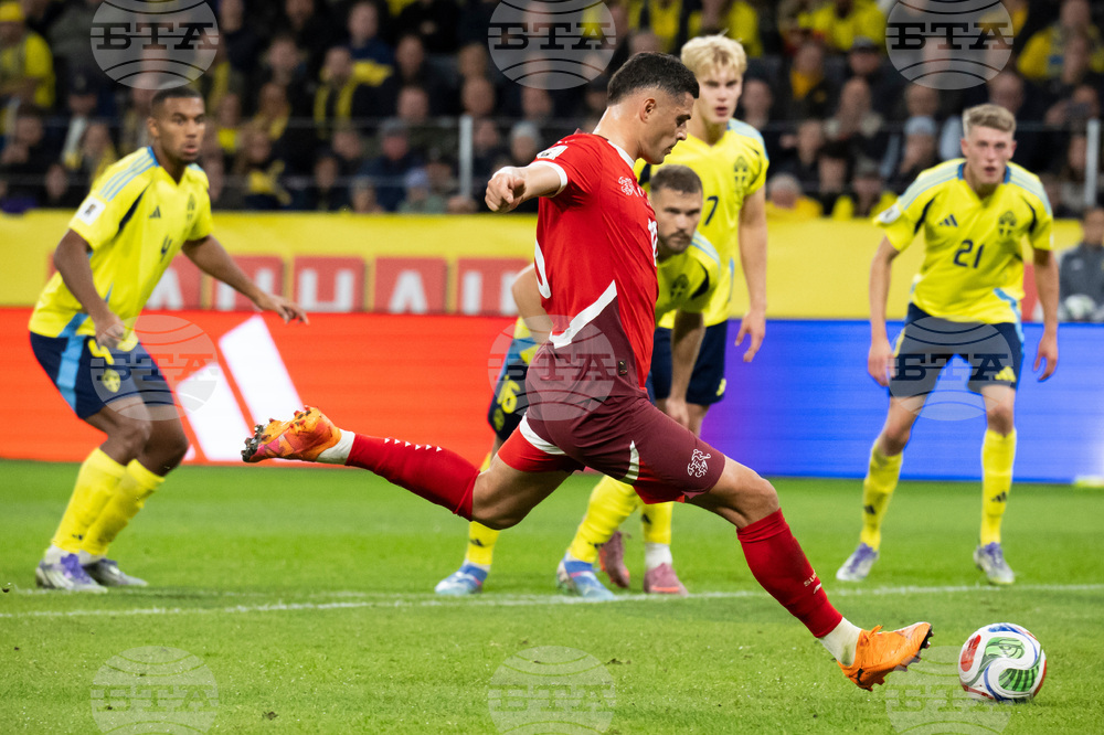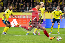 Switzerland's Granit Xhaka scores his side's first goal with a penalty shot during a World Cup qualifying soccer match between Sweden and Switzerland at Strawberry Arena, in Stockholm, Sweden, Friday, Oct. 10, 2025. (Anthony Anex/Keystone via AP)