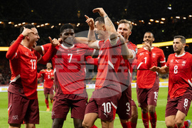 Switzerland's Johan Manzambi, left, celebrates with teammates Granit Xhaka and Fabian Rieder after scoring his side's second goal during a World Cup qualifying soccer match between Sweden and Switzerland at Strawberry Arena, Friday, Oct. 10, 2025, in Stockholm, Sweden. ( Anthony Anex/Keystone via AP)