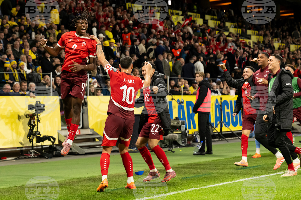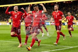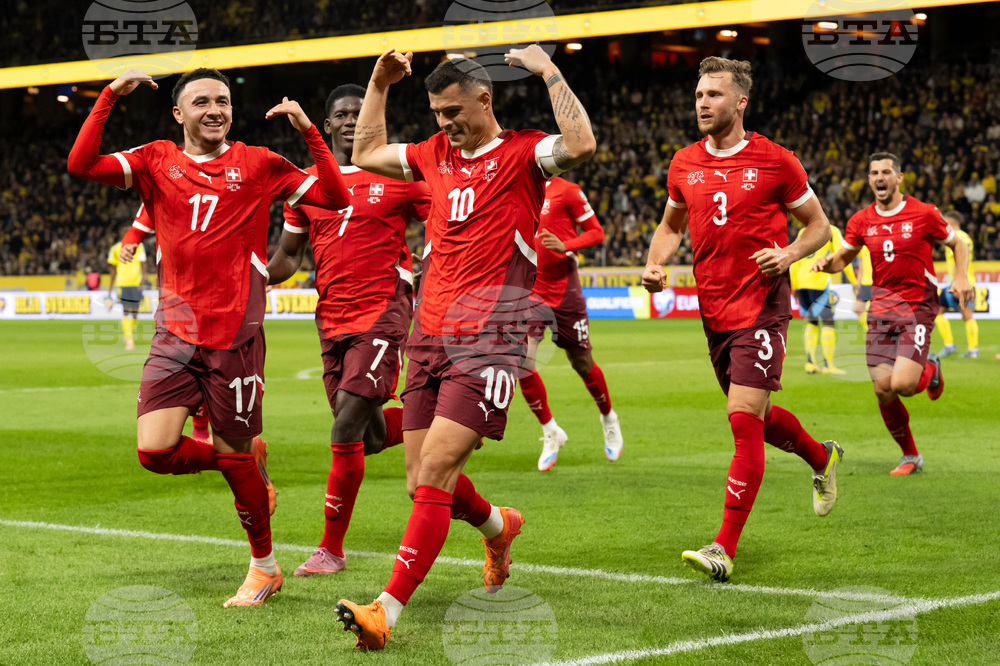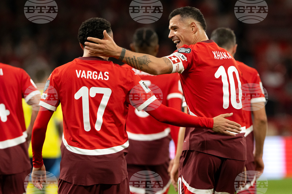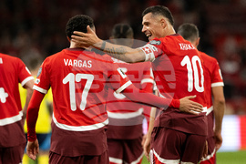 Switzerland's Granit Xhaka, right, celebrates with teammate Ruben Vargas after scoring his side's first goal with a penalty shot during a World Cup qualifying soccer match between Sweden and Switzerland at Strawberry Arena, in Stockholm, Sweden, Friday, Oct. 10, 2025. (Anthony Anex/Keystone via AP)