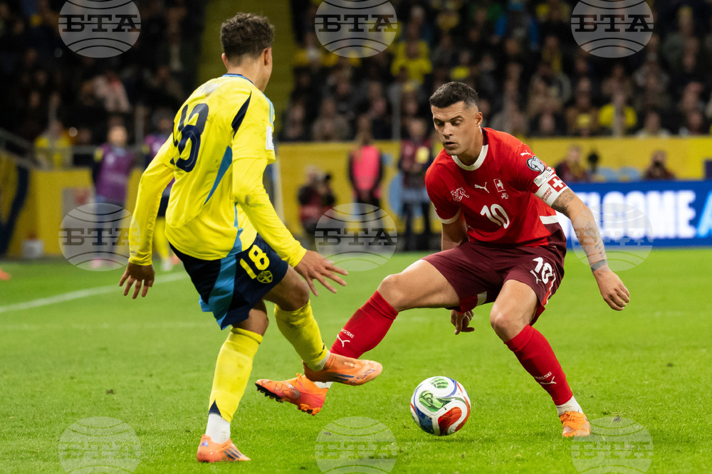 Switzerland's Granit Xhaka, left, and Swedens Ken Sema challenge for the ball during a World Cup qualifying soccer match between Sweden and Switzerland at Strawberry Arena, in Stockholm, Sweden, Friday, Oct. 10, 2025. (Anthony Anex/Keystone via AP)