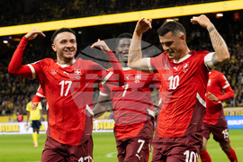 Switzerland's Granit Xhaka, right, celebrates with teammates Ruben Vargas, left, and Breel Embolo, back, after scoring his side's first goal with a penalty shot during a World Cup qualifying soccer match between Sweden and Switzerland at Strawberry Arena, in Stockholm, Sweden, Friday, Oct. 10, 2025. (Anthony Anex/Keystone via AP)