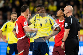 Swedens Viktor Gyoekeres, left, and Switzerland's Nico Elvedi battle for the ball during a World Cup qualifying soccer match between Sweden and Switzerland at Strawberry Arena, Friday, Oct. 10, 2025, in Stockholm, Sweden. ( Anthony Anex/Keystone via AP)