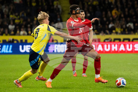 Switzerland's Ruben Vargas and Sweden's Gabriel Gudmundsson, front, in action during the World Cup qualifying soccer match between Sweden and Switzerland at Strawberry Arena in Stockholm, Sweden, Friday Oct. 10, 2025. (Stefan Jerrevång/TT via AP)