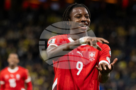 Switzerland's Johan Manzambi celebrates after scoring his side's second goal during a World Cup qualifying soccer match between Sweden and Switzerland at Strawberry Arena, Friday, Oct. 10, 2025, in Stockholm, Sweden. ( Anthony Anex/Keystone via AP)