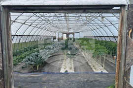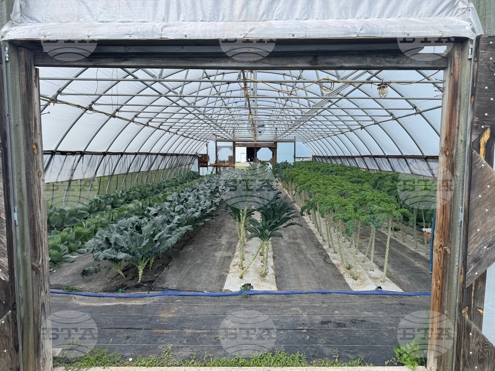 Two different varieties of kale and other vegetables are being grown at a high tunnel installed in the early 2000s at Cedar Creek Gardens near Okaton, S.D., seen on Sept. 22, 2025. (Bart Pfankuch/South Dakota News Watch via AP)