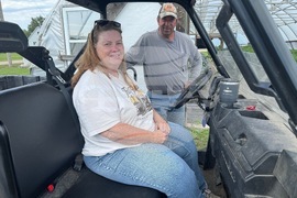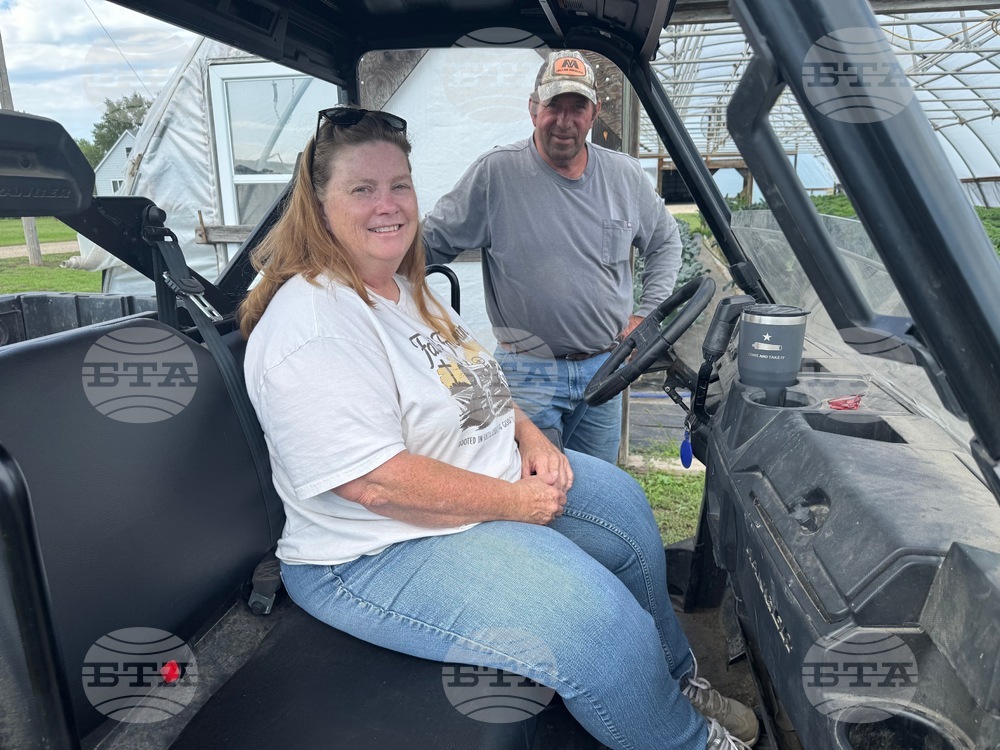 Peggy Martin and Bud Manke, co-owners of Cedar Creek Gardens near Okaton, S.D., pose for a portrait on Sept. 22, 2025. (Bart Pfankuch/South Dakota News Watch via AP)