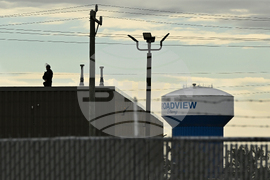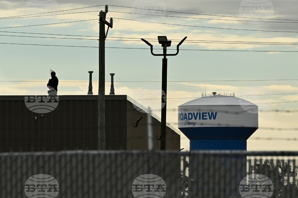 Law enforcement personnel patrol atop a building outside the ICE facility in Broadview, Ill., Friday, Oct. 10, 2025. (AP Photo/Paul Beaty)