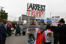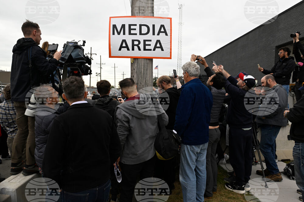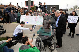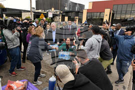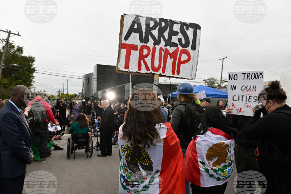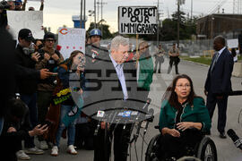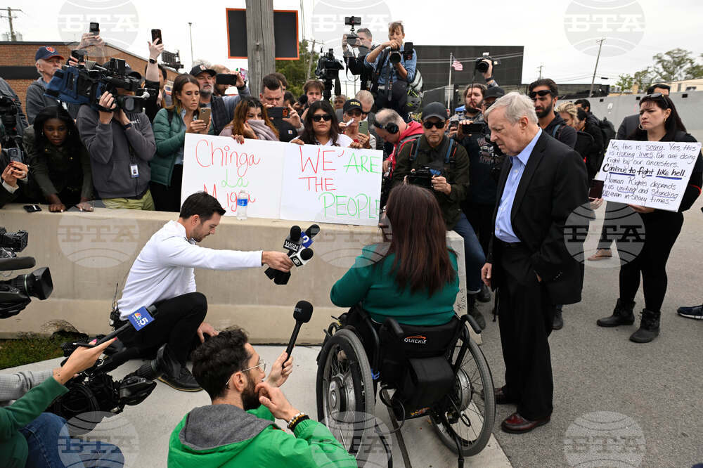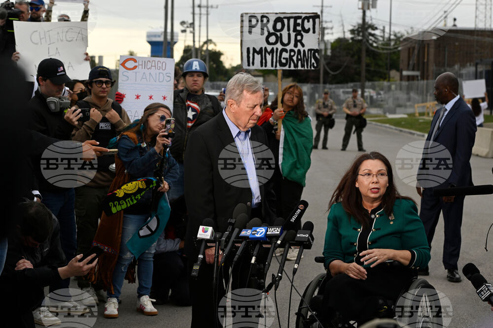 Sen. Dick Durbin, D-Ill., and Sen. Tammy Duckworth, D-Ill., speak with protestors outside the ICE facility in Broadview, Ill., Friday, Oct. 10, 2025. (AP Photo/Paul Beaty)