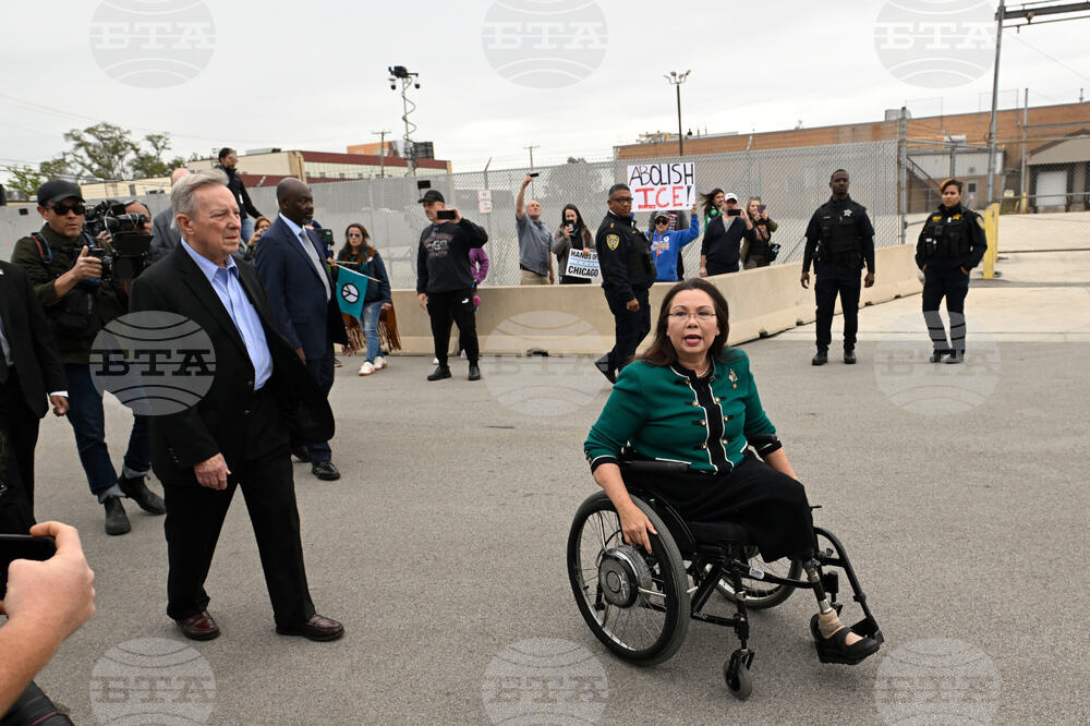 Sen. Tammy Duckworth, D-Ill., and Sen. Dick Durbin, D-Ill., are seen outside the ICE facility in Broadview, Ill., Friday, Oct. 10, 2025. (AP Photo/Paul Beaty)