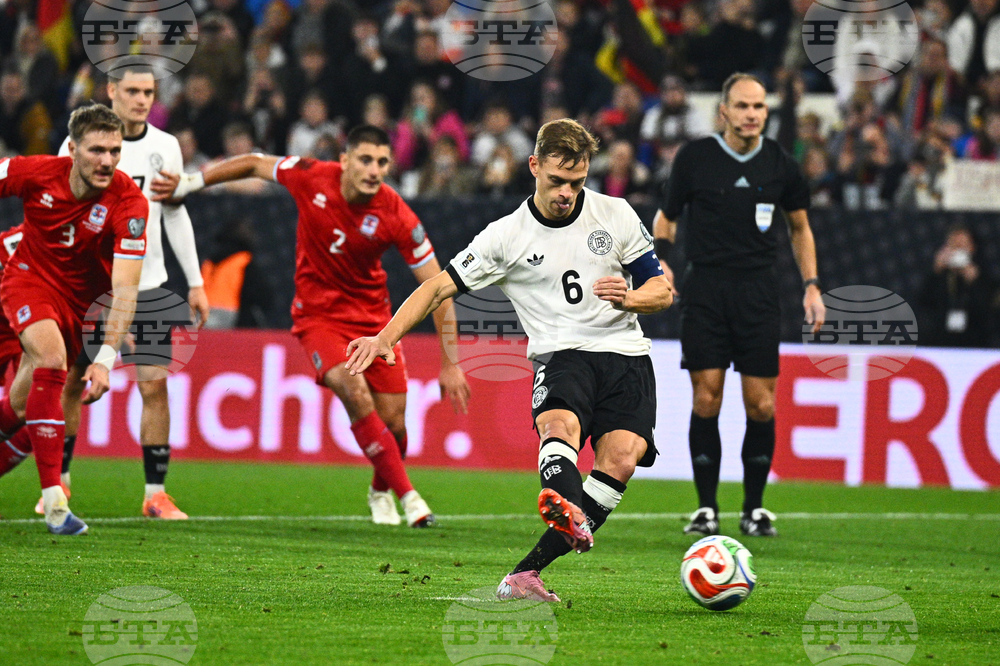 Germany's Joshua Kimmich scores from the penalty spot during the World Cup 2026 group A qualifying soccer match between Germany and Luxembourg in Sinsheim, Germany, Friday, Oct. 10, 2025. (Tom Weller/dpa via AP)