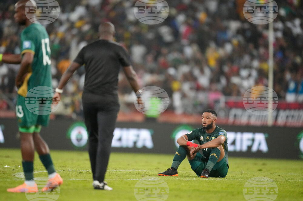 South Africa's Sipho Mbule, right, sits on the pitch as he reacts at the end of a World Cup Group C qualifying soccer match between South Africa and Nigeria at the Free State stadium in Bloemfontein, South Africa, Tuesday, Sept. 9, 2025. (AP Photo/Themba Hadebe)