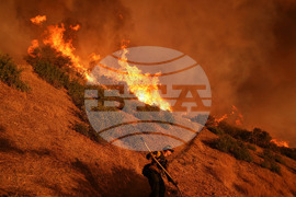FILE - A firefighter battles the Palisades Fire in Mandeville Canyon, Jan. 11, 2025, in Los Angeles. (AP Photo/Jae C. Hong, File)