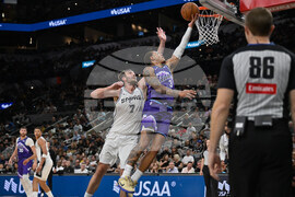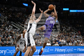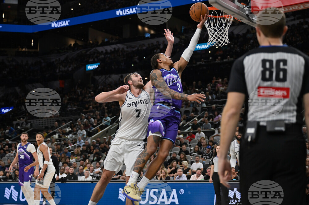Utah Jazz guard Keyonte George (3) goes to the basket against San Antonio Spurs center Luke Kornet (7) during the second half of a preseason NBA basketball game, Friday, Oct. 10, 2025, in San Antonio. (AP Photo/Darren Abate)