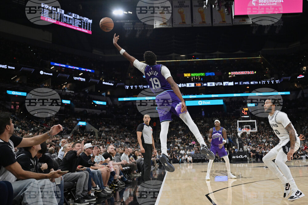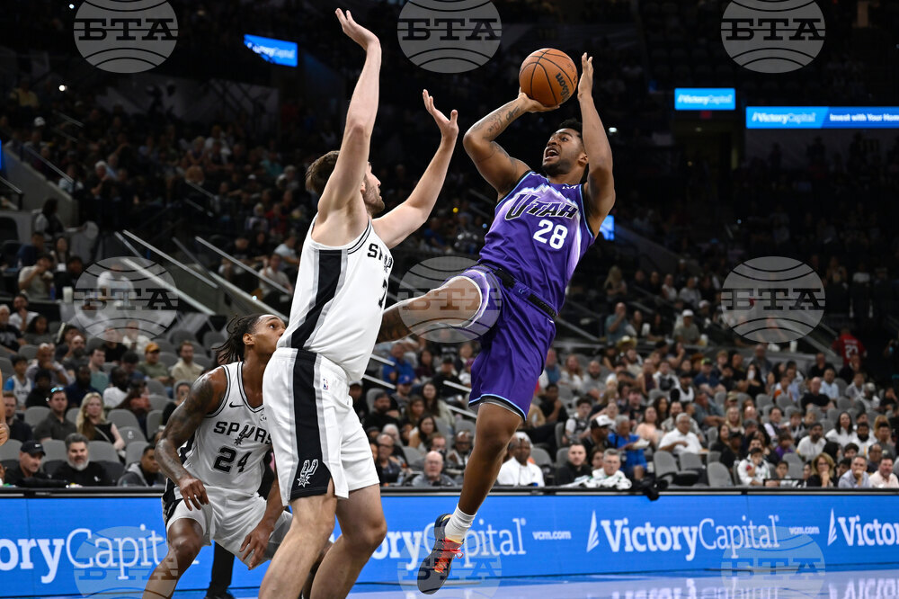 Utah Jazz forward Brice Sensabaugh (28) shoots against San Antonio Spurs center Luke Kornet during the first half of a preseason NBA basketball game Friday, Oct. 10, 2025, in San Antonio. (AP Photo/Darren Abate)
