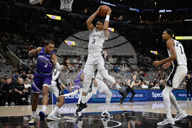 San Antonio Spurs forward Keldon Johnson, center, grabs the rebound ahead of Utah Jazz guard Keyonte George, left, during the first half of a preseason NBA basketball game, Friday, Oct. 10, 2025, in San Antonio. (AP Photo/Darren Abate)