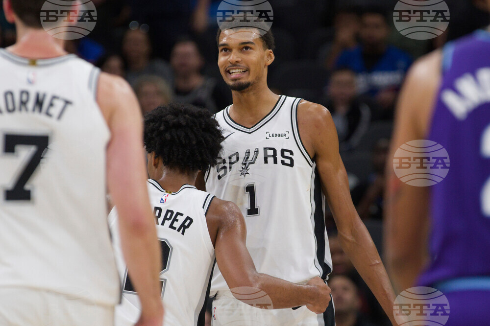 San Antonio Spurs forward Victor Wembanyama tips the ball to start a preseason NBA basketball game against the Utah Jazz, Friday, Oct. 10, 2025, in San Antonio. (AP Photo/Darren Abate)