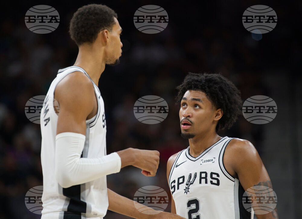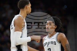 San Antonio Spurs center Victor Wembanyama, left, speaks with teammate Dylan Harper, right, during the first half of a preseason NBA basketball game against the Utah Jazz, Friday, Oct. 10, 2025, in San Antonio. (AP Photo/Darren Abate)