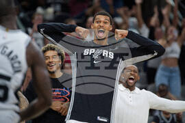 San Antonio Spurs center Victor Wembanyama, center, celebrates after a basket by Spurs guard David Jones Garcia, left, in overtime during a preseason NBA basketball game against the Utah Jazz, Friday, Oct. 10, 2025, in San Antonio. (AP Photo/Darren Abate)