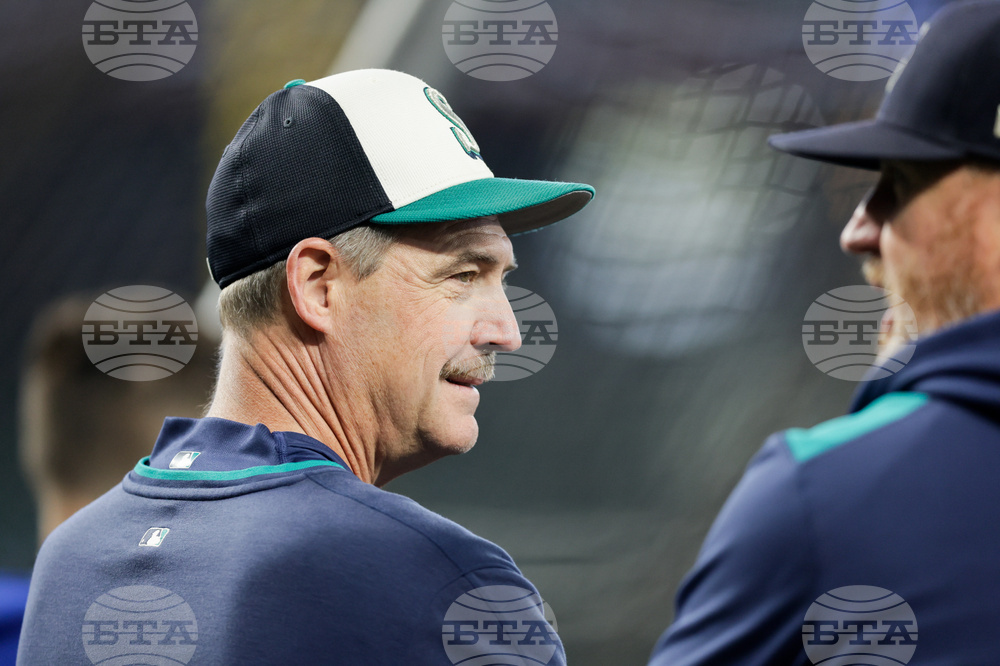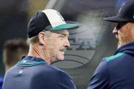 Seattle Mariners manager Dan Wilson, left, watches players take batting practice before Game 5 of baseball's American League Division Series against the Detroit Tigers, Friday, Oct. 10, 2025, in Seattle. (AP Photo/John Froschauer)