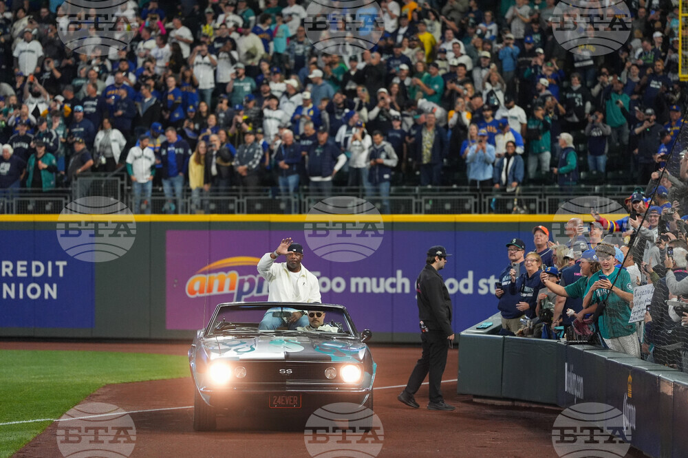 Ken Griffey Jr. is driven on the field before Game 5 of baseball's American League Division Series between the Seattle Mariners and the Detroit Tigers, Friday, Oct. 10, 2025, in Seattle. (AP Photo/Lindsey Wasson)