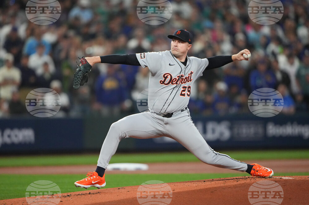 Detroit Tigers pitcher Tarik Skubal (29) throws out Seattle Mariners left fielder Randy Arozarena at first after a gound ball during the first inning in Game 5 of baseball's American League Division Series Friday, Oct. 10, 2025, in Seattle. (AP Photo/Lindsey Wasson)
