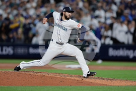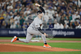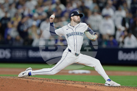 Seattle Mariners pitcher Logan Gilbert throws during the tenth inning in Game 5 of baseball's American League Division Series against the Detroit Tigers, Friday, Oct. 10, 2025, in Seattle. (AP Photo/John Froschauer)