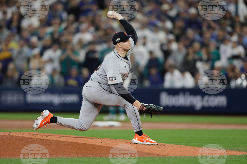 Detroit Tigers pitcher Tarik Skubal throws during the first inning in Game 5 of baseball's American League Division Series against the Seattle Mariners, Friday, Oct. 10, 2025, in Seattle. (AP Photo/Lindsey Wasson)
