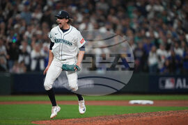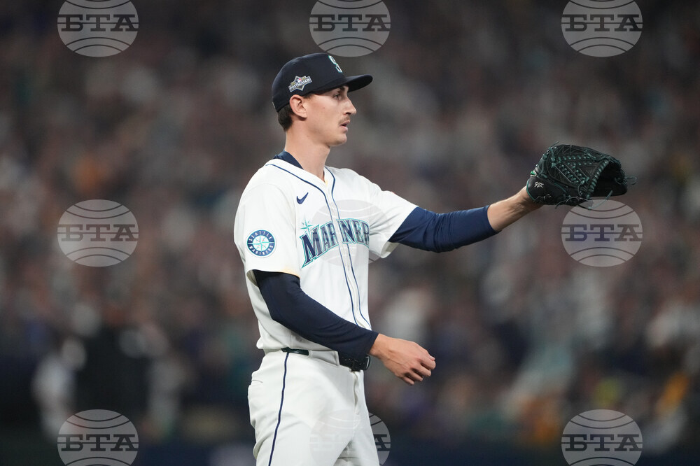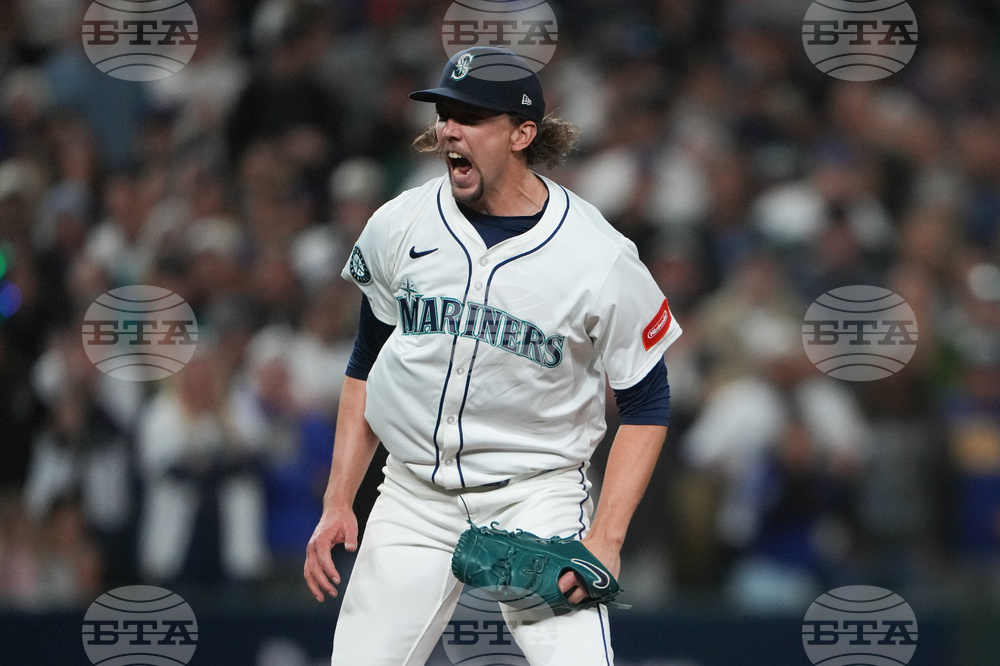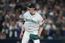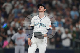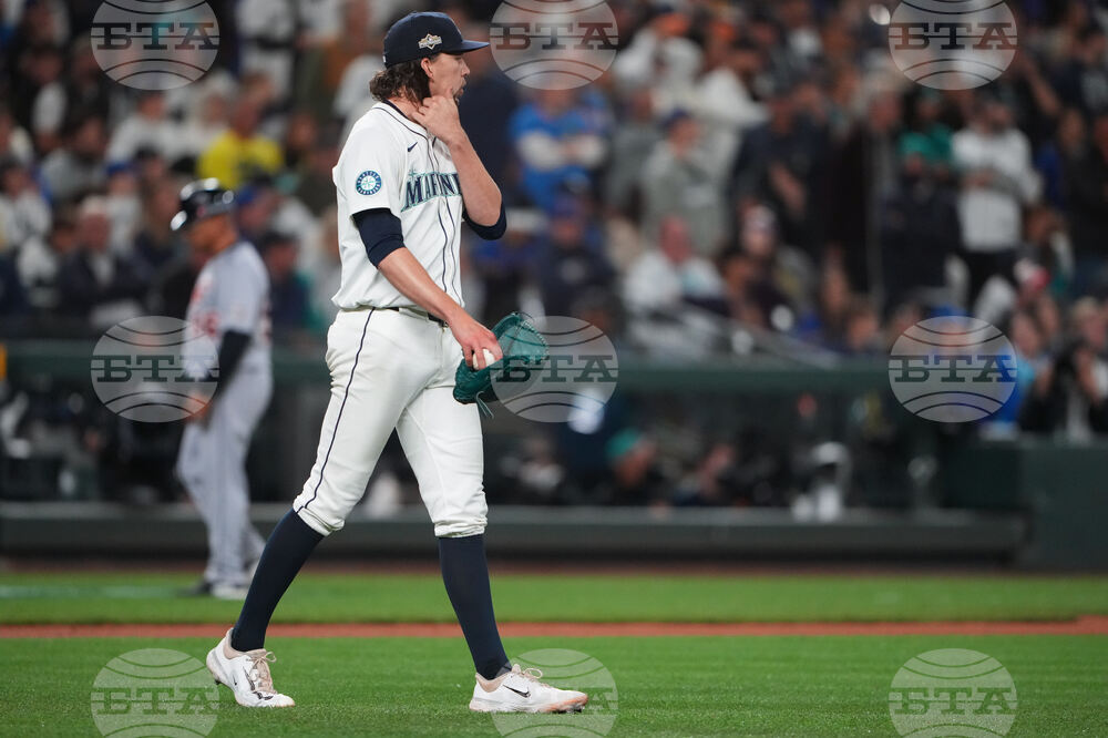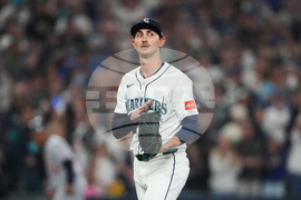 Seattle Mariners pitcher Logan Gilbert reacts to striking Detroit Tigers second baseman Colt Keith to end the top of the 11th inning in Game 5 of baseball's American League Division Series Friday, Oct. 10, 2025, in Seattle. (AP Photo/Lindsey Wasson)